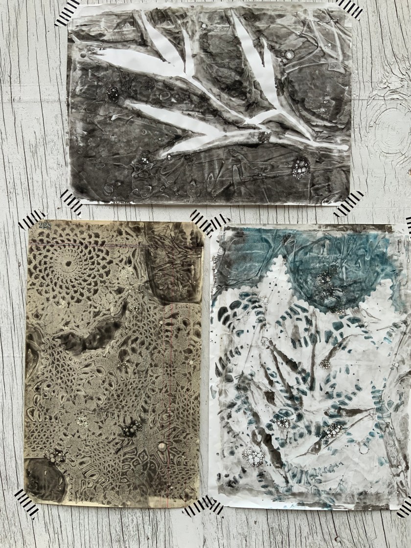 Today I made a slab of gelatin (actually I made that yesterday) in a cookie pan and used it to make mono prints of bamboo leaves and crochet doilies!