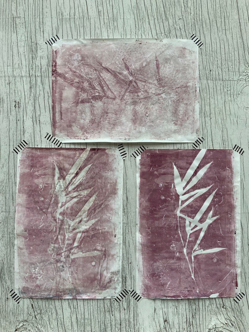 By the end of my printing play session, my gelatin slab was pretty well used and starting to distribute blobs of gelatin hither and thither, but I had some lovely prints and it was well worth making the plate and giving it a go.