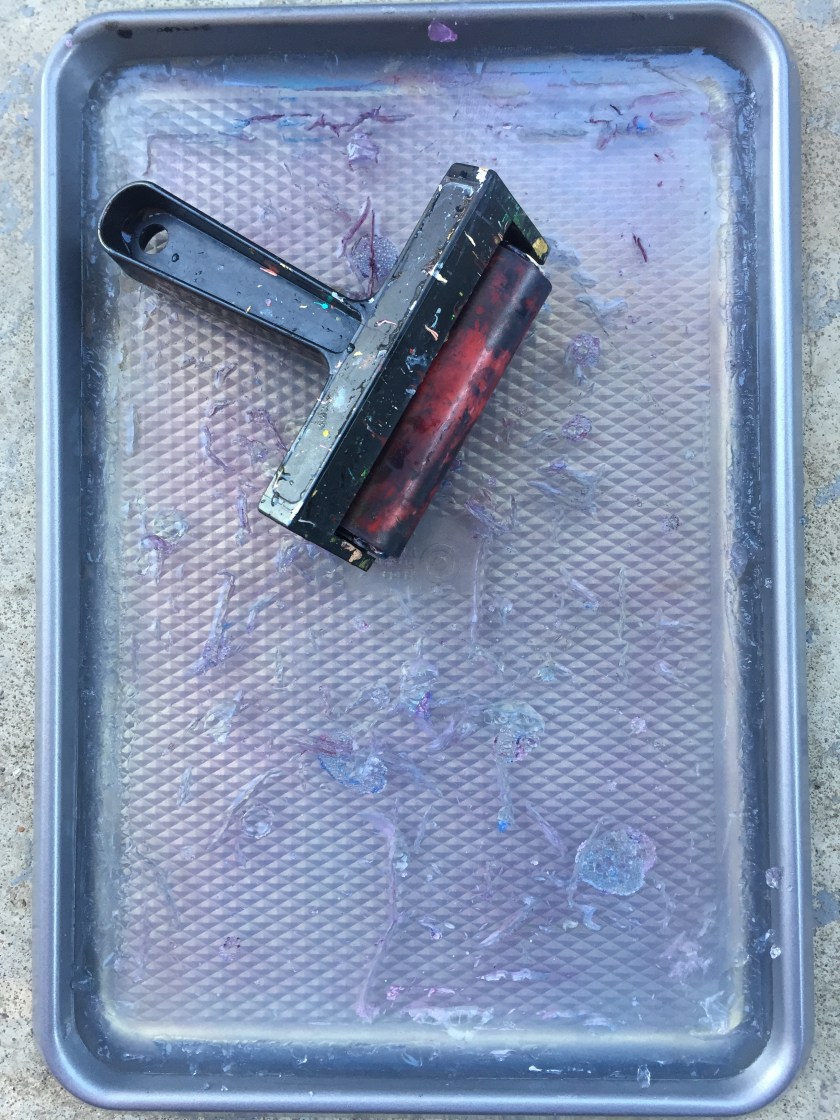 Making the ‘plate’ was super easy, I used 4 envelopes of unflavored gelatin according to the instructions on the packet (they suggested apple juice but I went for water!) and I left it in the fridge over night to set.  I forgot to remove any surface bubbles so I had immediate access to some extra texture (oops!). There are lots of videos and recipes for gelatin plates on the inter webs but I was happy with this one as it lasted for an afternoon of printing and I can make another one when I need it.