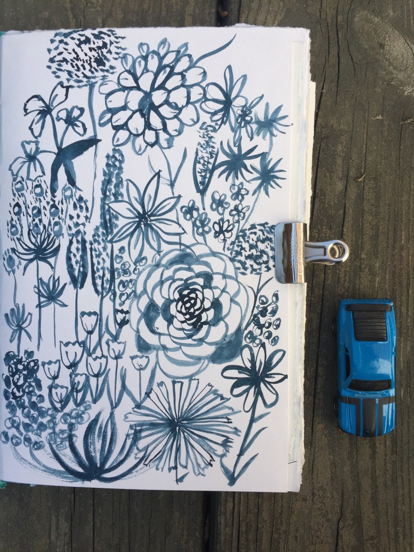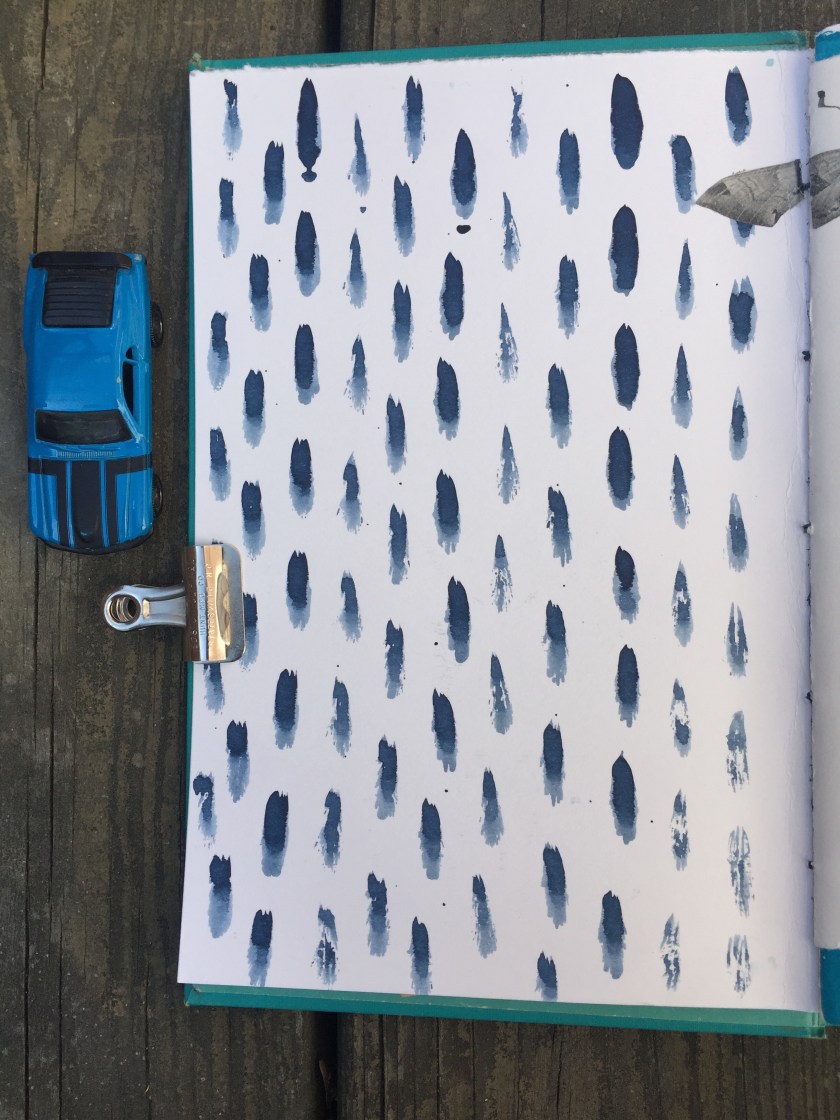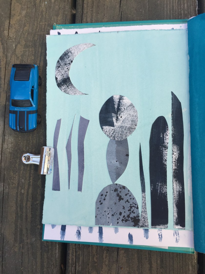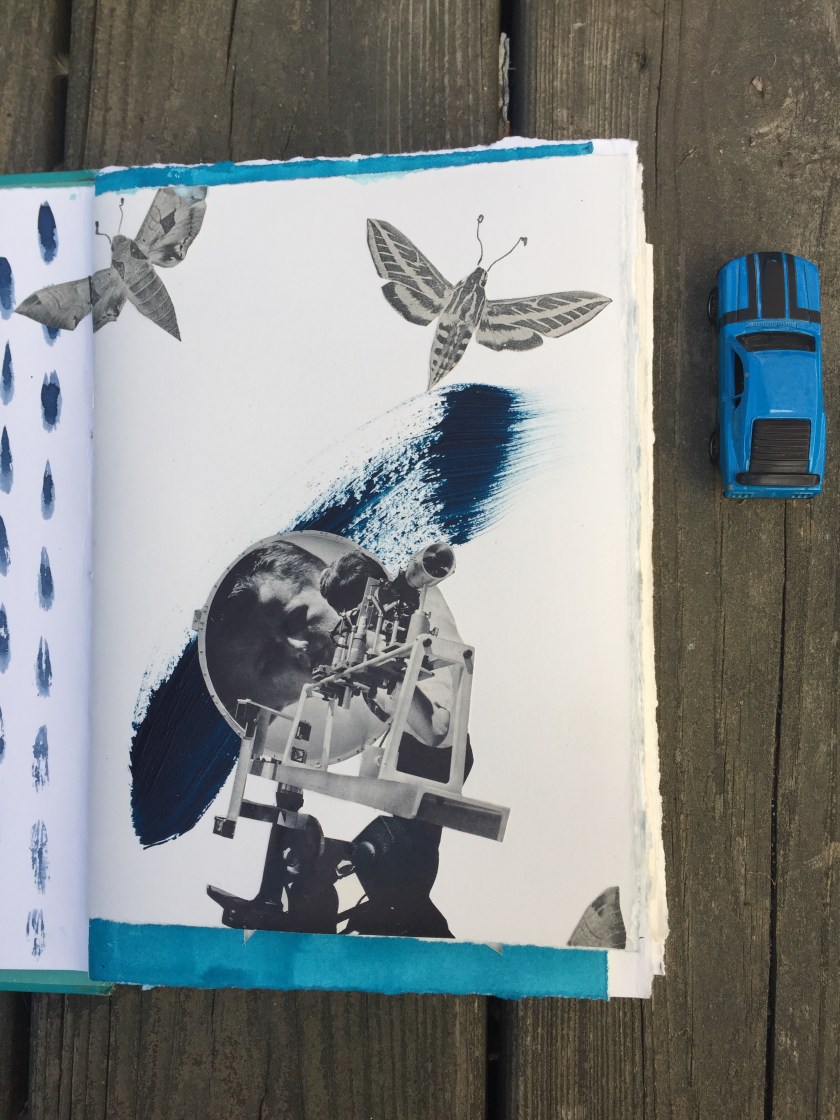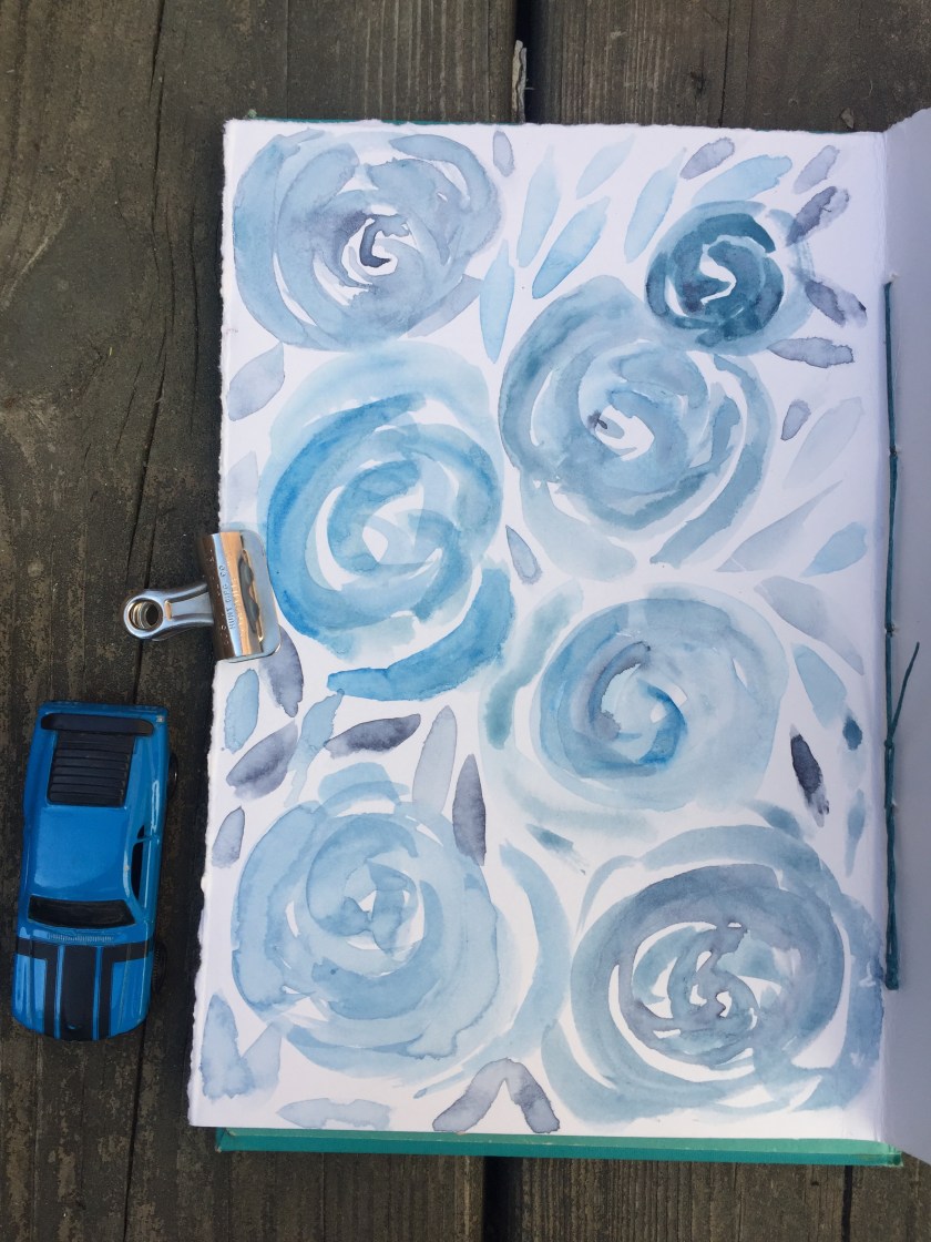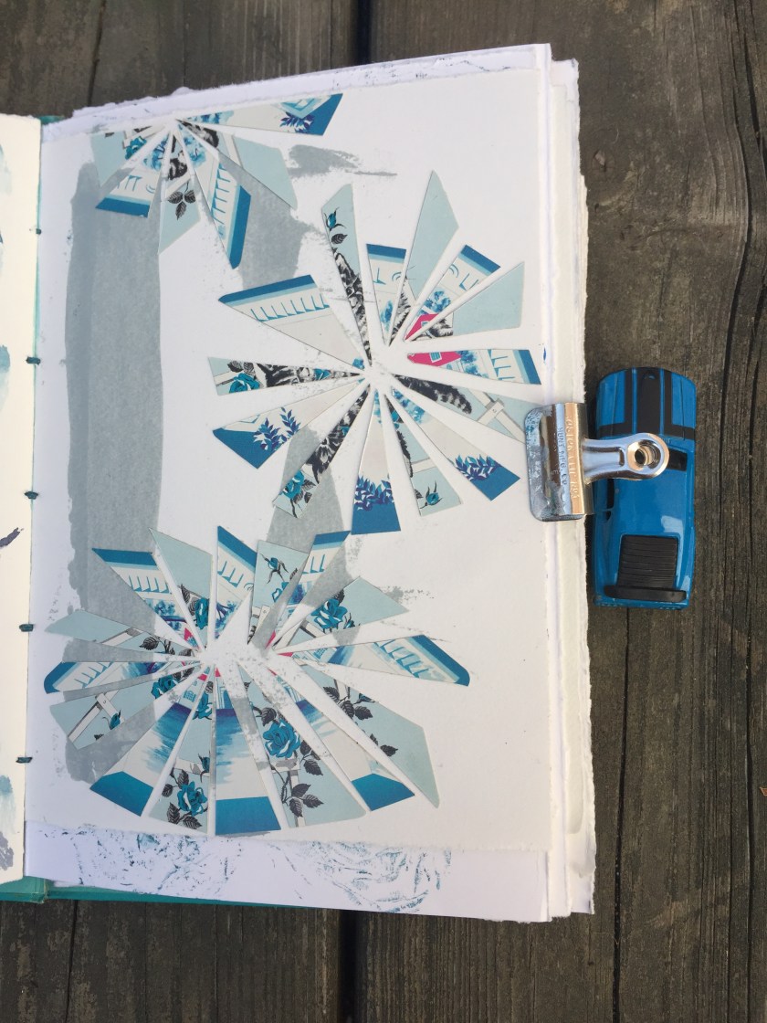So far I have painted flowers, collaged, cut paper and made a terrible selfie! I am enjoying it and I am also allowing myself to work ahead, if the mood strikes I will make a page so that I can have some in my pocket as back up for days when I don’t make my blue page.