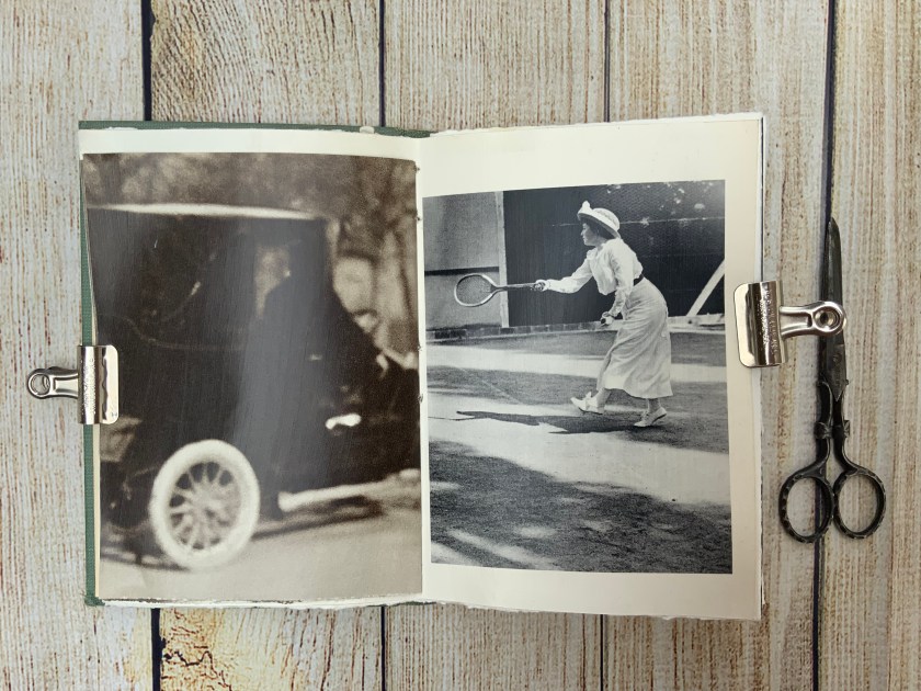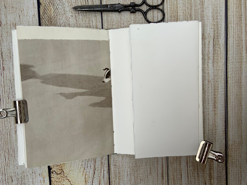 I removed the book block and kept a few illustrations for future art journaling use and added my own pages. These consist of watercolor paper and a few images from an old book of photographs. I used clear gesso on the photo pages so that I can add marks or paint when I am filling the book.