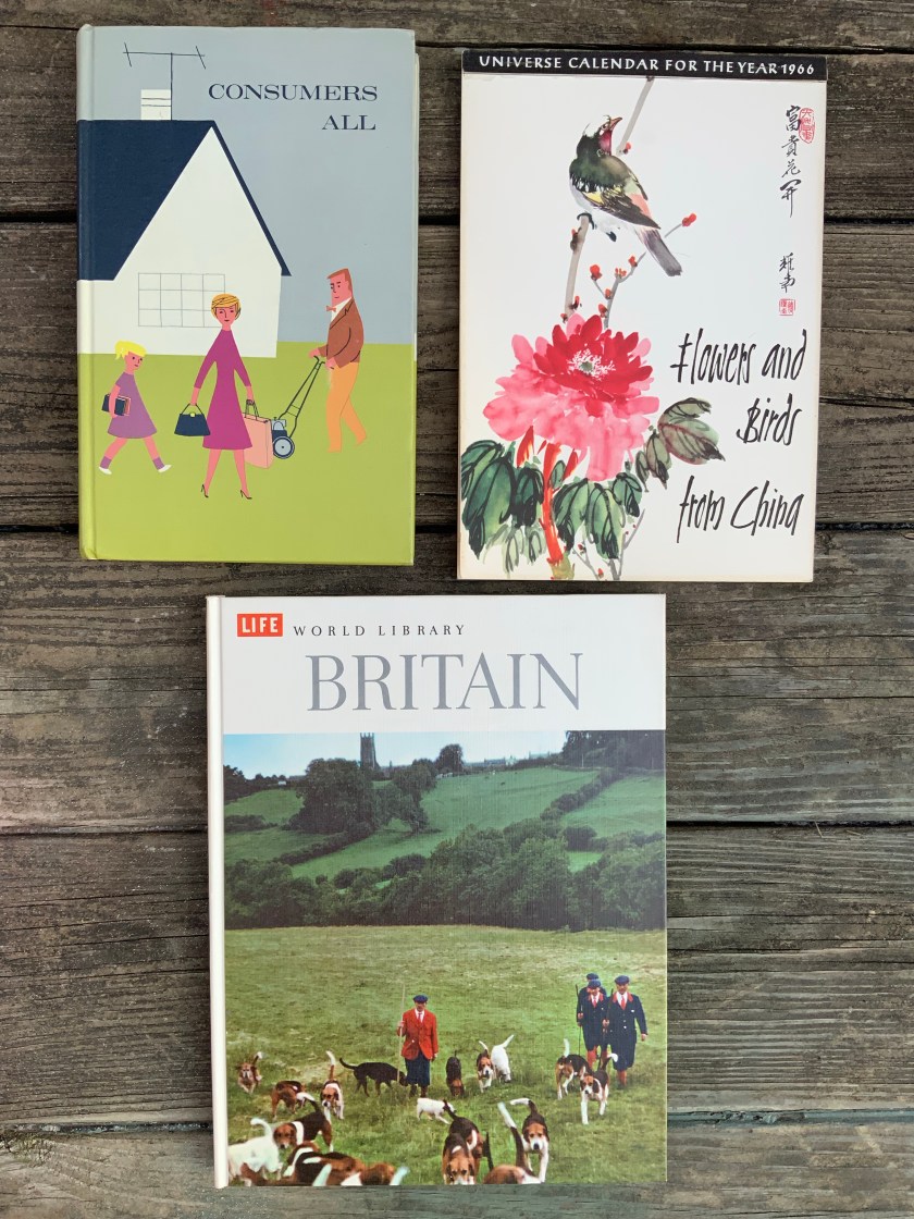 I found a modern paper cutter for $2 which was a good start but a bit boring. I seemed to wade through dolls, beanies and Garfield paraphernalia for the next few rooms and was beginning to feel deflated. The basement was full of Christmas decorations and some books so I had a browse through the books. I picked up a couple from the 1960’s which I can use images from and maybe use the covers for a sketchbook. I am not sure I have any plans for the 1966 calendar but it has some beautiful paintings in it.