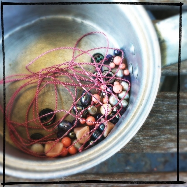 I made a little pan of beads to make a knotted necklace. Pretty pinks and greys with a hint of amethyst.