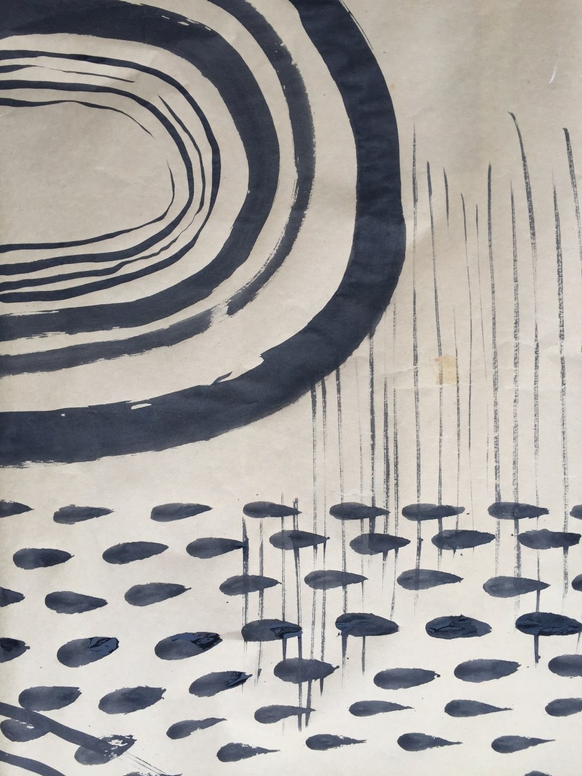 I then persuaded some more of the tightly rolled paper to lay flat with a couple of books from the cottage we are staying in. I had three sheets ready to paint on, so I made some marks and brush strokes to get my pages moving in the direction of a mini art journal or three.